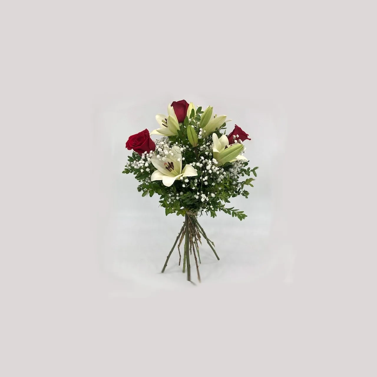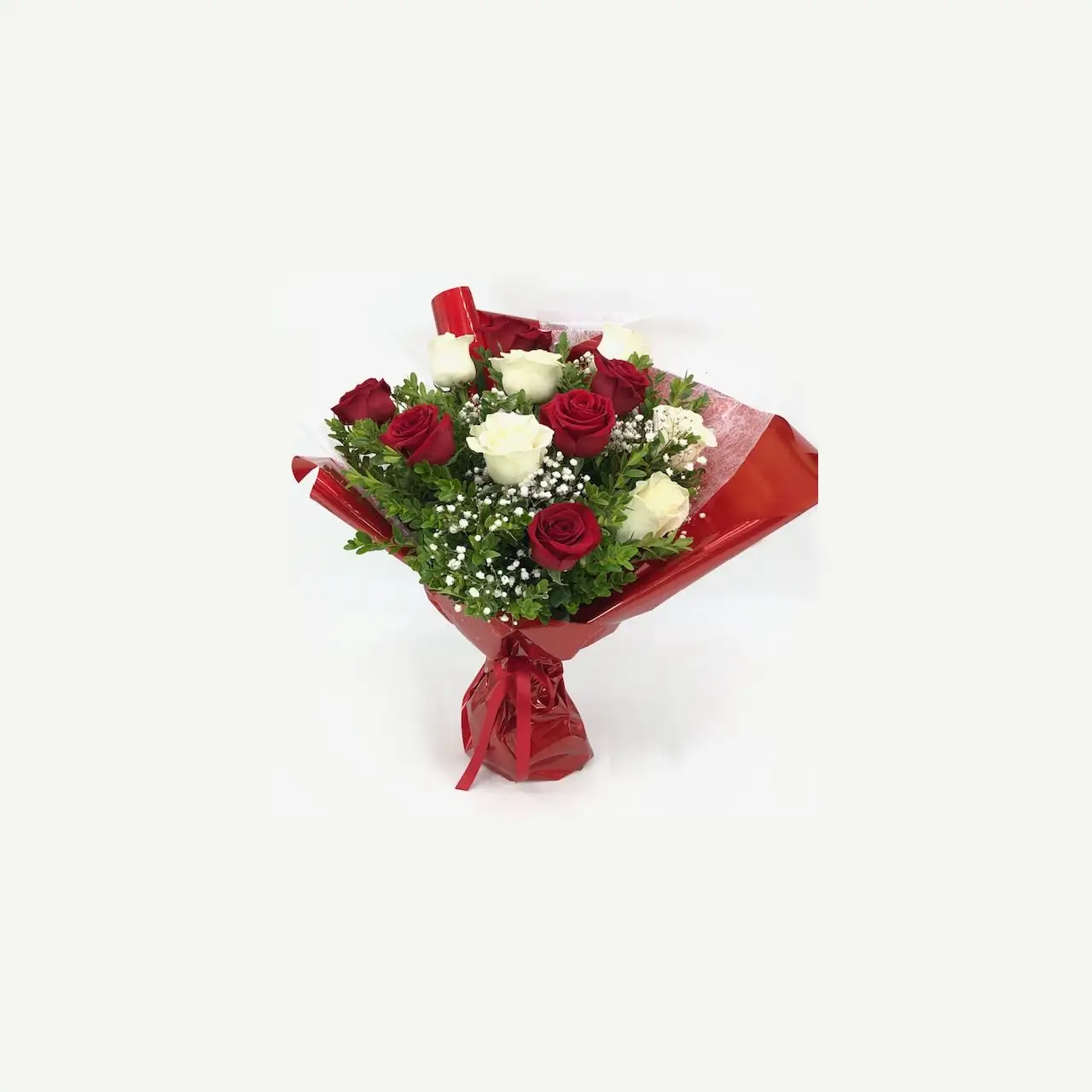 Este ramo clásico combina rosas rojas y verdes, perfecto para un regalo sofisticado y lleno de simbolismo. Ideal para transmitir pasión y compromiso en el Día de San Valentín.