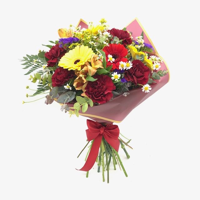 Ramo de flores intensas donde destacan 3 gerberas amarillas y una roja , claveles rojos y pequeñas margaritas blancas y toques azules de estatic, acompañado de verdes y presentado con papel burdeos; tiene un aspecto elegante y lleno de energía, perfecto para celebraciones, agradecimientos o detalles especiales.