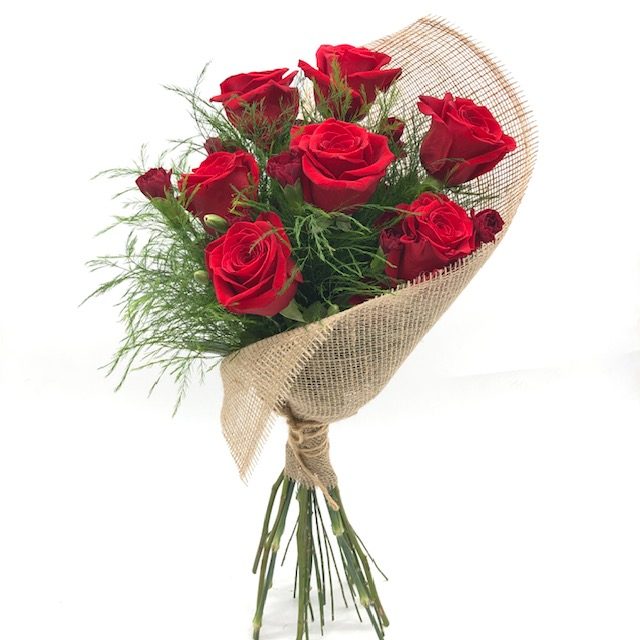 Tonos Rojos Y granate acompañados del verdes inundan el color .Atrevido y elegante. Composición del ramo 7 Rosas rojas ,3 clavellinas color granate y verde decorativo.