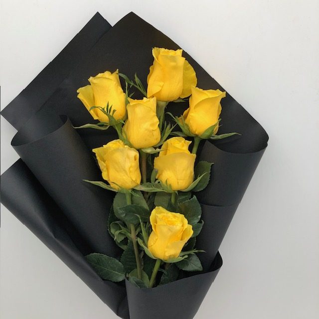 Regalar Rosas amarillas para celebrar momentos de éxito, agradecer a alguien o simplemente para enviar buenas vibras y energía positiva sería el regalo perfecto .( 7 rosas envueltas en papel negro mate)