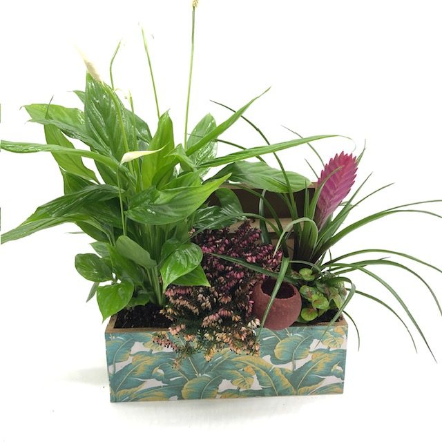 Spatifilium en una caja baúl ,fácil de cuidar con riego moderado y luz sin sol directo.Este tipo de composiciones con pequeñas plantas rosadas y púrpura , son versátiles para hogares,oficinas,con plantas que combinan bien en interiores luminosos.