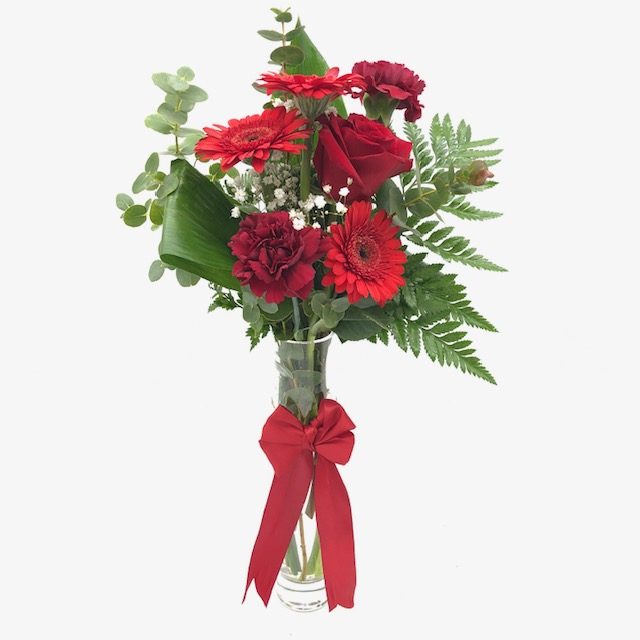 El rojo intenso de las gerberas,claveles y la rosa evoca pasión ,romanticismo y seducción,como su aura irresistible.(jarrón incluido)