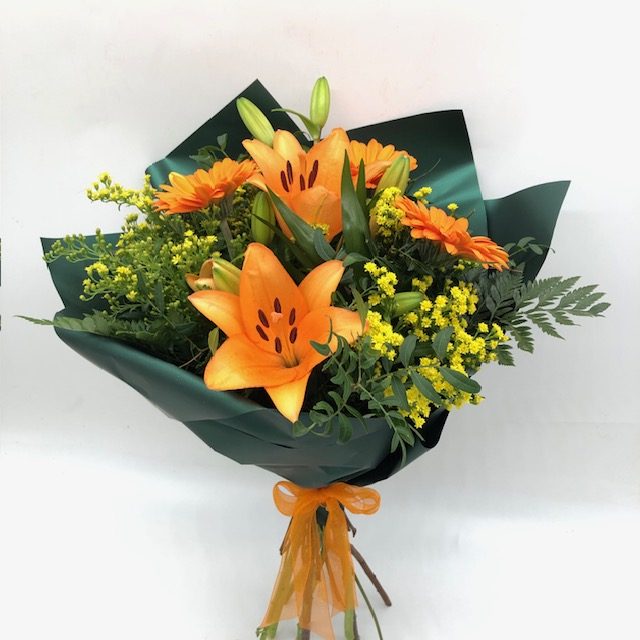 Sorprende con este espectacular ramo de lirios y gerberas en tonos naranjas que irradian energía y calidez perfecto para cumpleaños o simplemente para alegrar el dia.