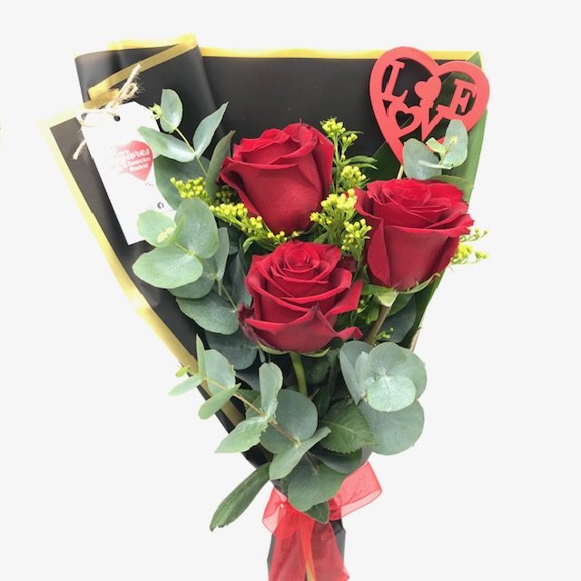 Ramo encantador de tres rosas rojas ,eucalipto y toques de solidago amarillo,envuelto en papel negro con corazón rojo simbólico de amor intenso.Un gesto clásico de pasión eterna .