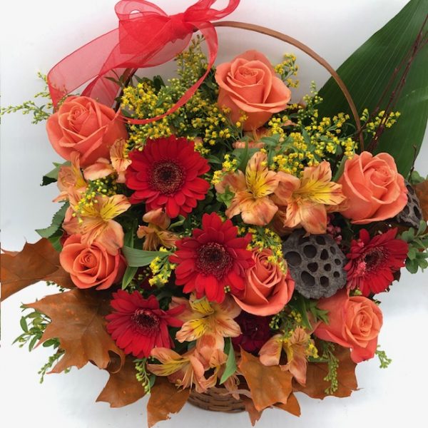 Un atrevido centro de colores explosivos. Naranjas, , verdes y rojos unidos en un arreglo de rosas, gerberas y astromelias.