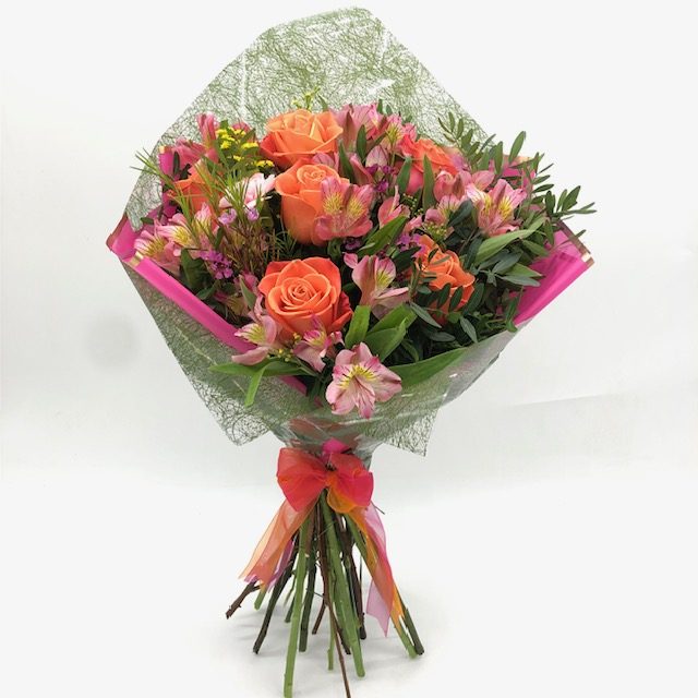 En este arreglo floral encontramos las tonalidades del color rosado y naranja ya que  se encuentran en las tonalidades que consideramos cálidos mezclados con el verde es el que mejor contrasta ya que es el color complementario .