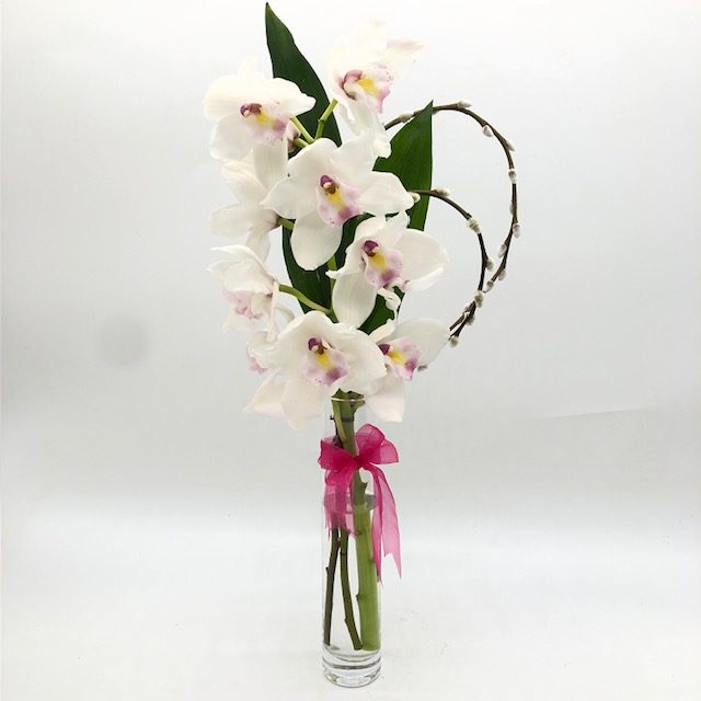 Orquídea cymbidium blanca con toques rosados .( jarrón incluido)