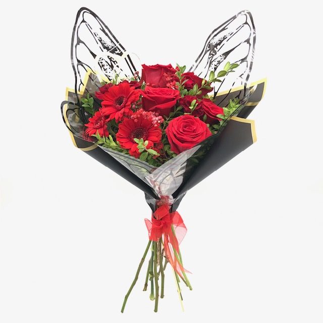Tonos Rojos del verdes inundan el color .Atrevido y elegante. Composición del ramo 5 Rosas rojas ,3 clavellinas color granate , 3 gerberas rojas y verde decorativo.