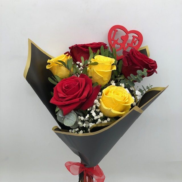 Ramo de 3 rosas rojas y 3 rosas amarillas envueltas en papel negro con borde dorado,decoradas con paniculata,verde fresco y un corazón ,,LOVE»perfecto para expresar amor,cariño y energía positiva.